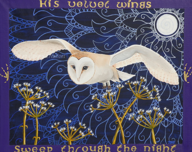 "Owl in Moonlight" is from my "Animals in Folklore" collection. Celebrating the spirituality of animals in folklore. I have used stars, spirals and mandala patterns to capture the spirituality of the British Barn Owl. With words from "What Sees the Owl" by Elizabeth Sears Bates.