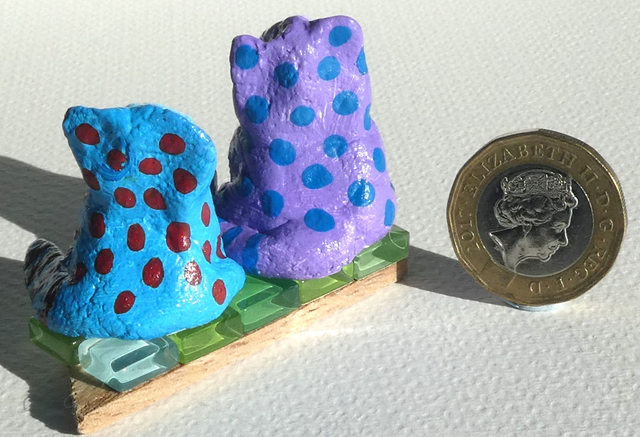 "Kitties on a Canvas Wedge" are fun handmade gifts. Purple and blue, approx w 5.5cm x h 4cm x d 3cm. Code PBKOCW